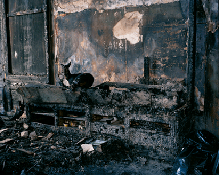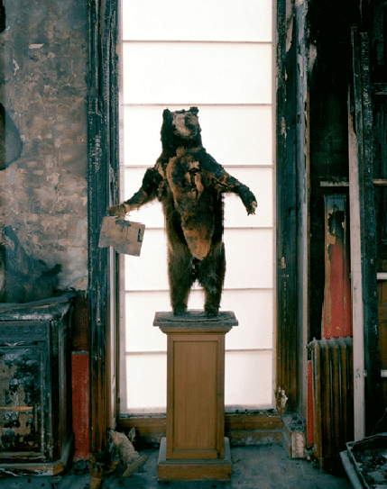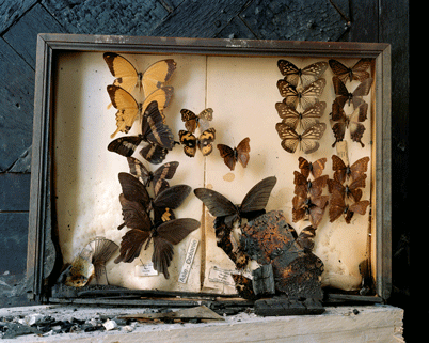 Martin d'Orgeval's photographs show the animals and insects that survived the disaster in situ, against a background of charred woodwork in the shop that had been their habitat since their "natural" death. The objects and the location form an entire work, the result of a strange, unique process in which creation, conservation and destruction have followed on from one another – a process completed and given closure by photography.