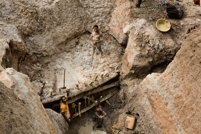 Miners buy from the chief of the mine the permission to dig in a certain spot. They work day and night with their bare hands, unaware that the mineral is radioactive. They clear the forest, dig a large hole in the ground and from here a horizontal tunnel of up to ten metres. They extract mud, mix it with water and sieve it until coltan deposits on the bottom. The entire operation is carried out with no safety measures; sometimes the tunnels collapse causing the death of those inside.
