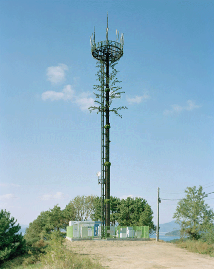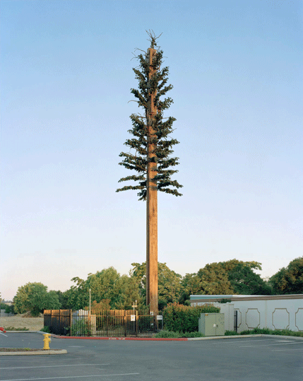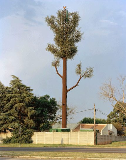 Robert Voit's project New Trees documents the apparently lucrative manufacturing industry which specialises in camouflaging mobile phone masts to look like trees. The bizarre mutant offspring of this marriage are beginning to populate the landscapes of the US, South Africa, Korea, Italy, Portugal and now the UK. For Voit these so-called 'magic hoods' of steel, fibreglass and plastic demonstrate that the background noise of verbal communication increasingly encroaches upon the visual domain.