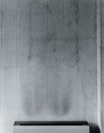 This ghostly objectivity infects her earlier series, "Topographical Analogy", depicting the interior walls of derelict houses about to be demolished. With a forensic eye for detail she shows us the stained and faded wallpaper that has silently witnessed the lives of the inhabitants of the house. In this case there is no clue from the title of the work – simply "Wallpaper III", or "Heat I" (above) – as to the events that may have taken place in the house and the identity of the people who lived within these walls. We are left simply to speculate from the visual clues. The pattern of the paper itself, the standard of its upkeep, all suggest the taste, the standard of living, even the race of the people that lived there.