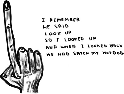 David Shrigley has some drawings in "Laughing in a Foreign Language", at The Hayward Gallery until April.