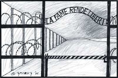The drawing features the slogan "La fame rende liberi" (Hunger makes one free) - an overt reference to the sign over the gates at Auschwitz reading "Arbeit macht frei" (Work makes one free) - in front of the wall which divides Palestine from Israel, and occasionally Palestine from Palestine. Within hours of publication, the newly elected Speaker of Parliament, Fausto Bertinotti, was harassed by embarrassing questions about it, as Liberazione is sponsored by his political party. A verbose and ineloquent debate ensued. Most writers gave Apicella a serious, if not pedantic, grilling. I'll spare you the details.